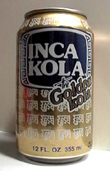 黄金に輝く怪しい缶。これが「インカ帝国にちなんで」つくられたというインカコーラ。 以前、評論がビックサイト西館に配置されていた頃のコミケで、どこかのサークルさんがスペースに中身入りの2.0lPETを飾っていたのを見たが、ある意味で危険な雰囲気が漂っていたのを記憶している。 先日S石さんにもいただいたが、ここに掲載したのは以前に仙台駅構内の輸入食料品店で購入したものの空き缶。(貰った方は2/20現在でまだ飲んでいない(^^;) なお、ここではコーラを「KOLA」と綴っているが、コーラの語源となった「コラの実」のコラは「COLA」でも「KOLA」でもどちらでも良いらしい。 | |