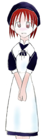 服と同じ紺の三角巾にフリル無しのエプロンドレスという、ある意味非常に正しいメイドスタイルです。