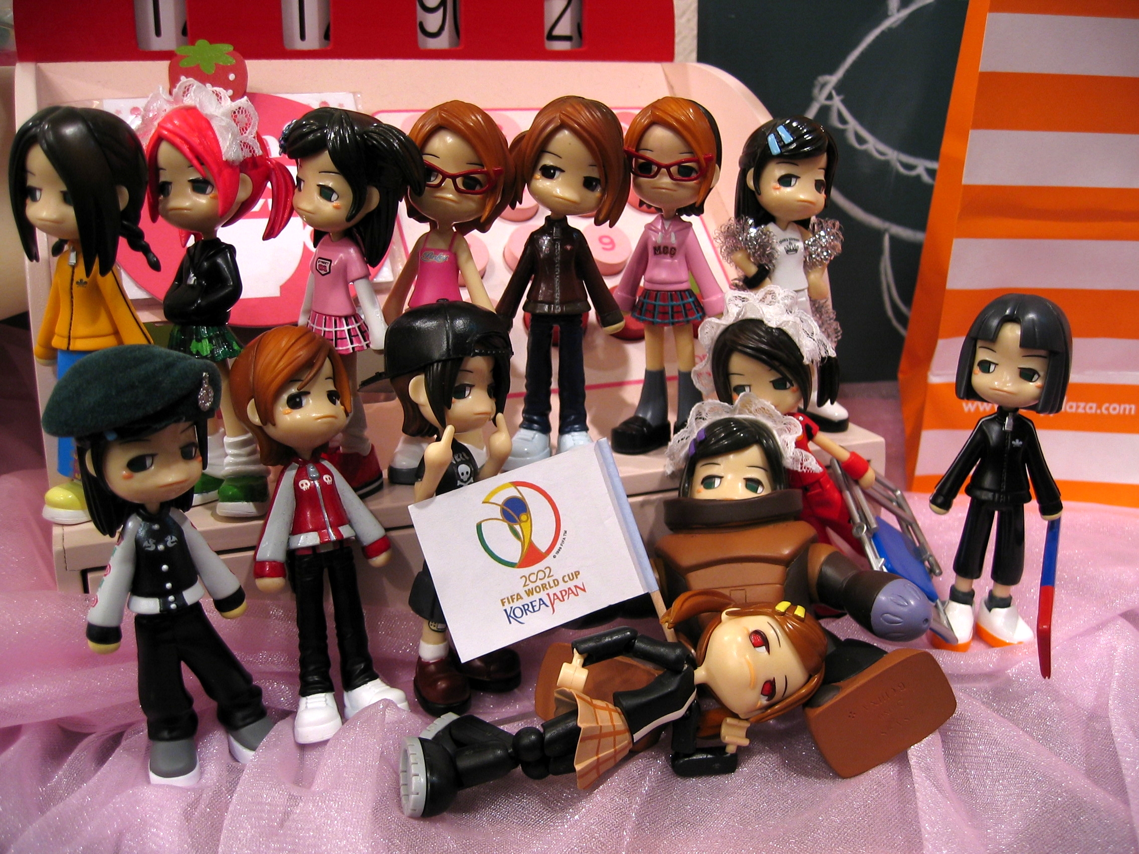 「ぴんきーず」。ピンク色の服だけで集合〜の図。レジ風の物体は実はカレンダーらしい…。