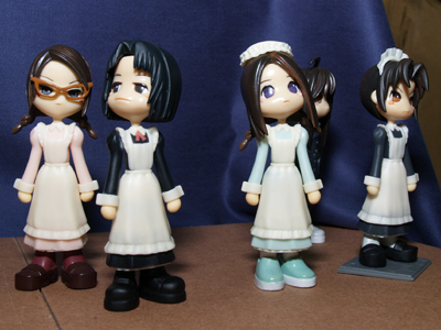 上段左「メイド服」、上段右「スーツ」&「コート」。下段「セーラー服」。メイド服のうち、ボンネットタイプ(写真内右から2番目)は次回以降に登場予定、らしい。