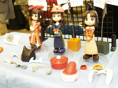 上段左、アニメ版の「ZOID」シリーズよりコトナ(左)とフィーネ(右)。上段右はMMO「ラグナロクオンライン」より「ハイプリースト」(左)、「プリースト」(中央)、「アコライト」(右)。手前はそれぞれのオプションパーツ群。